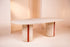 A minimalistic sculpted form, accentuated by details. An oblong shaped travertine slab rests on 2 chamfered fluted travertine legs, inlayed with afire red angled metal element. The table is a perfect match for a simple yet iconic piece.