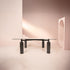 The combination of heavy marble legs with the square thin solid glass top creates an interesting contrast while the rounded edges and generous proportions provide a comforting feeling