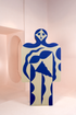 A tall fiberglass sculpture painted in soft ivory and cobalt blue. Luna celebrates fluidity in form, a piece that transforms light into movement and presence into emotion.