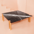 A sleek and generous cut of fine black Marquina marble sitting on top of a modern and minimalistic set of plated steel supports