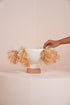 A short, rounded bowl with a defined neck, pairing smooth off-white ceramic with a terracotta base, accented by straw fringes that bring an organic, tactile charm.